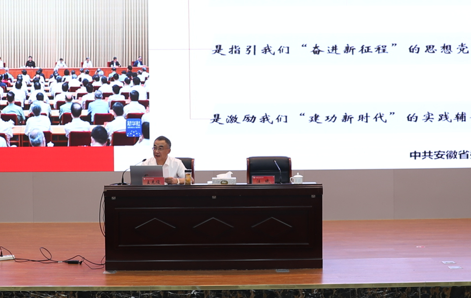 根据省委统一安排,9月14日下午,全省“举旗帜·送理论”学习贯彻习近平总书记在省部级主要领导干部专题研讨班上重要讲话精神、《习近平谈治国理政》第四卷省级示范宣讲报告会暨学校党委中心组(扩大)学习会在文津校区学术报告厅举行。省级示范宣讲团成员、省政协文化文史和学习委员会副主任王先俊教授作专题宣讲报告。省委讲师团主任科员刘杨,芜湖市委宣传部副部长、市人大常委会社会建设工作委员会副主任何世文,学校党政领导班子全体成员出席,报告会由党委书记汪斌主持。